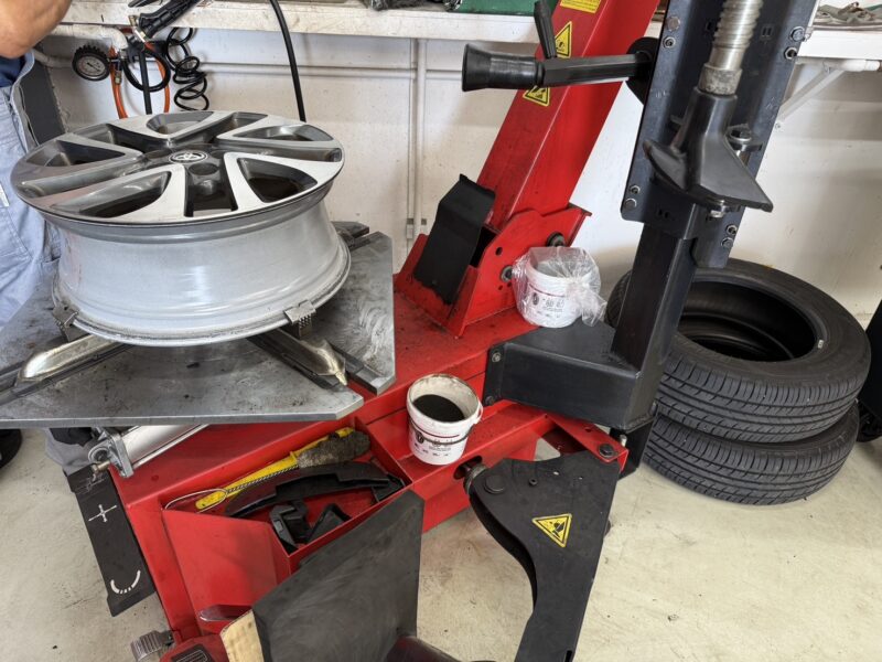 タイヤチェンジャーでタイヤを取り外し、新しいタイヤを取り付けます。今回はタイヤ4本の交換を行います。