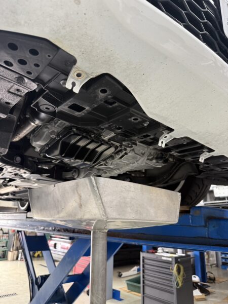 マルチリフトを使用してお車を上げ、アンダーカバーを取り外し、オイルパンからオイルを摘出します。